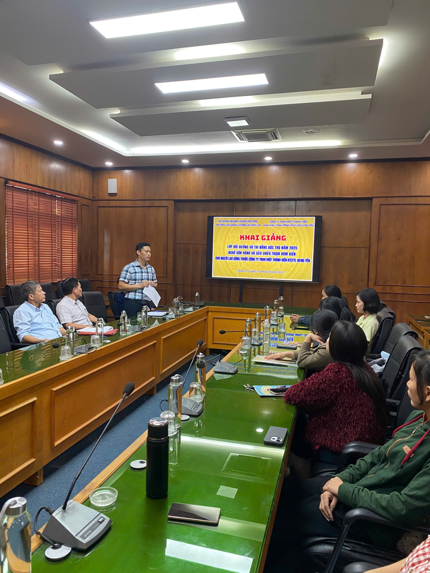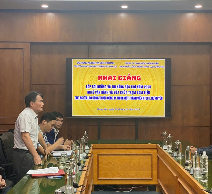 Ngày 28/10/2025 tại phòng họp 02, Trường Cao đẳng Cơ điện và Thủy lợi đã tổ chức khai giảng lớp bồi dưỡng nâng bậc thợ nghề Vận hành và sửa chữa Trạm bơm điện năm 2025 cho người lao động của Công ty TNHH Một thành viên KTCTTL Hưng Yên. Dự chương trình khai giảng có đồng chí Lý Hưng An – Phó Hiệu trưởng Nhà trường, đồng chí Lê Thế Mạnh – Phó Giám đốc Công ty TNHH Một thành viên KTCTTL Hưng Yên cùng dự có các đồng chí lãnh đạo các phòng chuyên môn, Khoa Thủy lợi và 26 học viên tham gia khóa học.