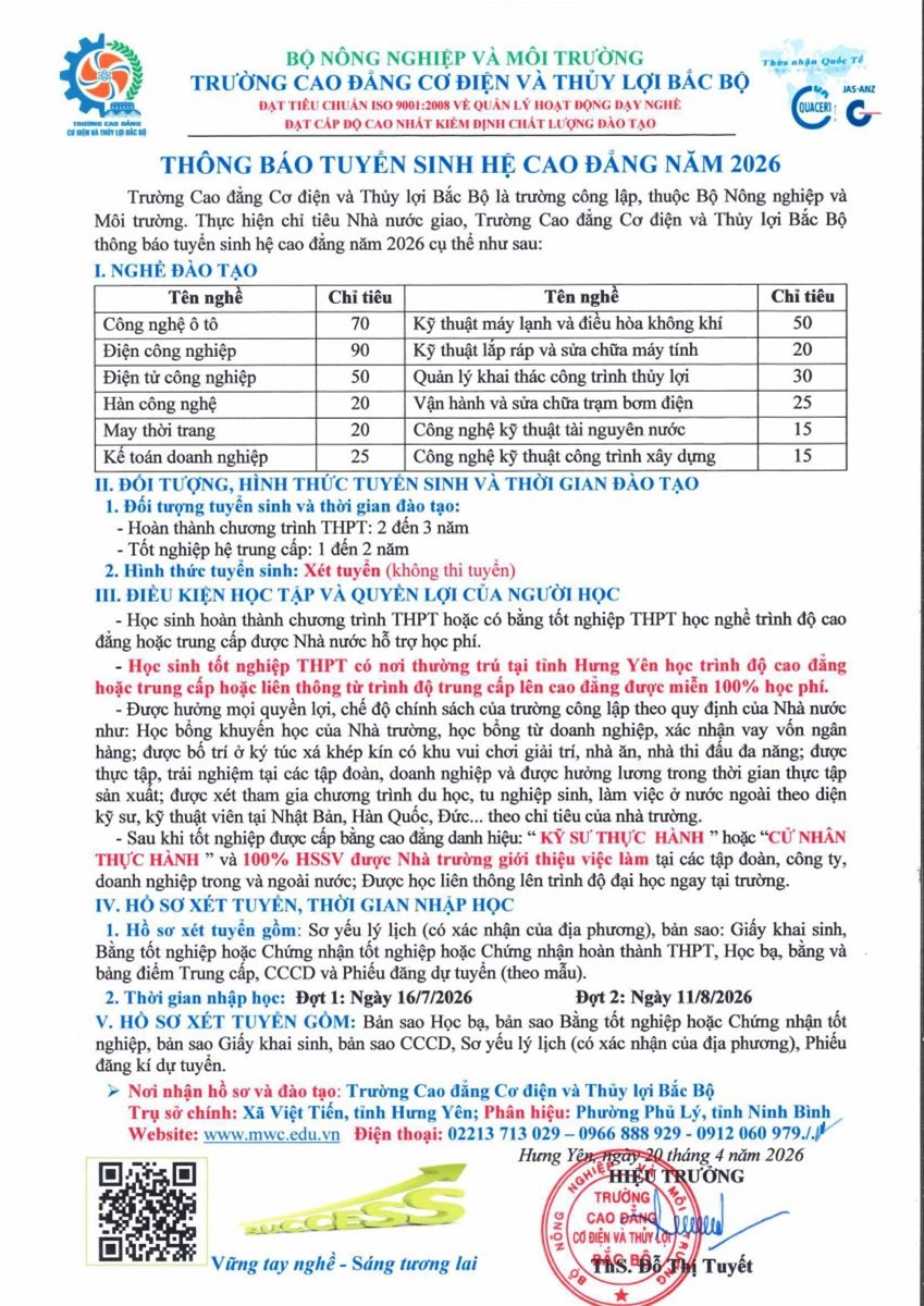 Thông báo tuyển sinh hệ cao đẳng năm 2026 23/04/2026 - 09:48 AM 1 lượt xem Cỡ chữ Về trang trước Gửi email In trang Tweet